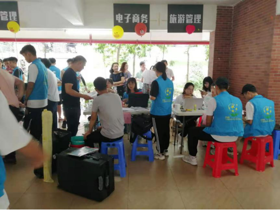 太阳成集团tyc122cc报道点设立在员工宿舍楼4栋架空层。从举牌引路,到新生信息录入和录取通知书的收集,再到带新生到指定地点进行信息登记和注册,这一系列的工作都有专门的志愿者负责,确保迎新工作做到“家长放心、员工安心”。
