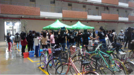 活动分为两部分同时进行,一部分志愿者上宿舍楼询问每个宿舍是否有意愿让志愿者清洗饮水机,若愿意则志愿者会把桶装水卸下并贴上标有宿舍号及饮水机信息的标签,然后搬运至架空层的清洗组进行清洗;另一部分为清洗组,负责清洗、消毒、冲洗、组装等,完成后搬运上楼。