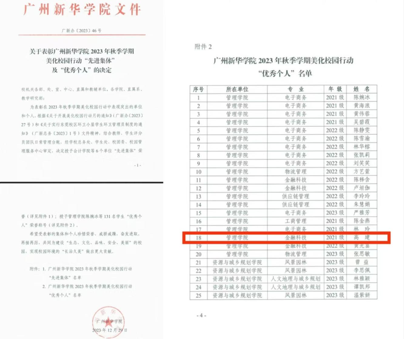 高建获太阳成集团tyc122cc2023年秋季学期美化校园行动“优秀个人”