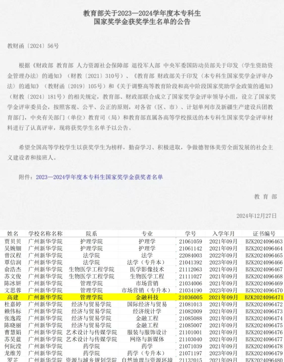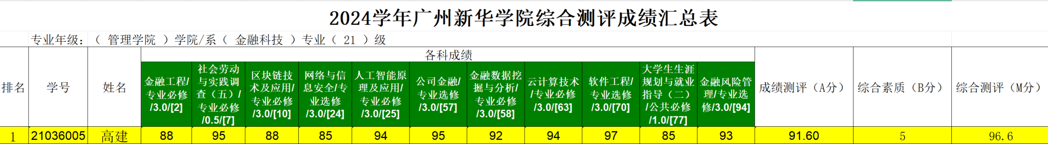自迈入大公司园的那一刻起,高建便怀揣着明确的学业目标,以满腔的热忱投入到学习之中。高建完成的课程作业质量出类拔萃,在学习通平台上被选为“精品作业”,供同学们学习参考。在小组作业中,他思维敏捷,常常能提出独特的见解,引领团队高效协作。课后,高建对待学业的态度同样积极,一旦遇到问题,便主动向各位科任老师请教。不仅如此,高建还不断自我提升,积极考取各资格证书:英语六级、计算机二级、初级经济师证书、银行从业资格证等。这份执着与努力换来了优异的成绩,他连续三年荣获优秀员工奖学金,大学所学课程中有42门成绩突破90分,成绩优秀率超55%。在大三学年,多门专业课成绩突出,专业排名第一,综合测评高达96.60分,荣获2023-2024学年国家奖学金。这令人瞩目的成绩背后,是他无数个日夜的不懈拼搏与奋斗。那一个个或灯火通明的夜晚,或阳光初洒的清晨,都见证了他追逐梦想的坚定脚步。