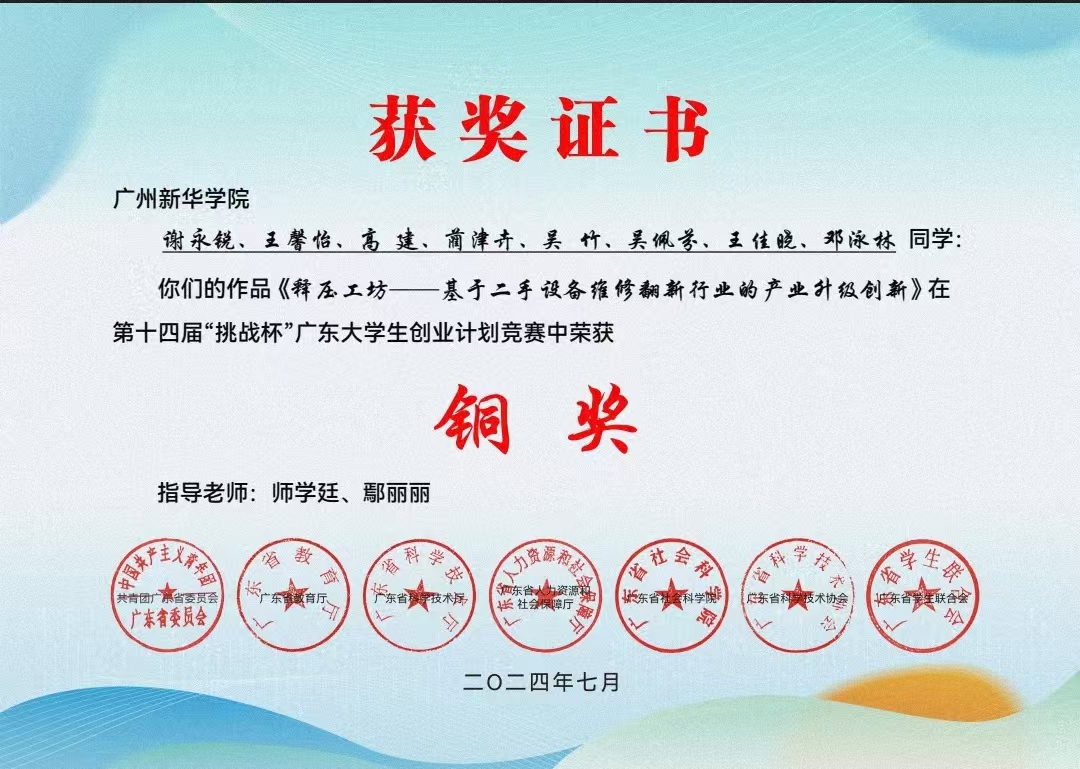 高建获第十四届“挑战杯”广东老员工创业计划竞赛铜奖证书