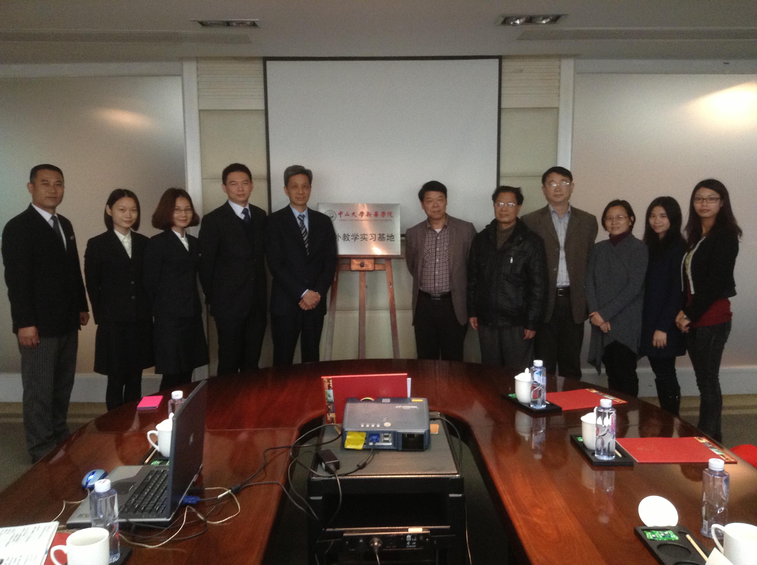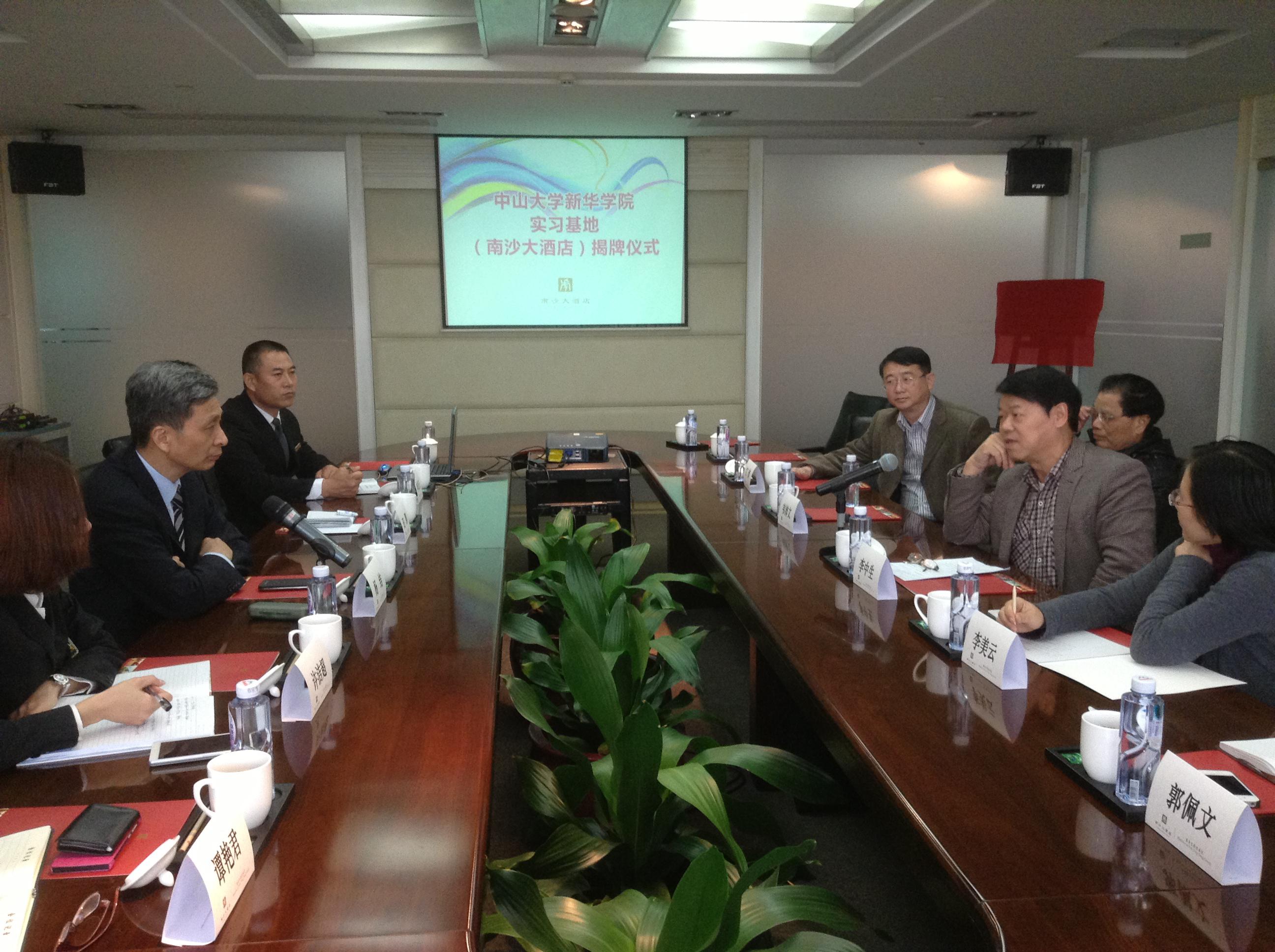 2014年1月3日,中山大学新华公司副经理李中生教授、经理助理江沛教授、管理学系主任韦沛文教授、系副主任李美云副教授及管理学系旅游管理专业教师等一行赴南沙大酒店给霍英东集团成员南沙大酒店实习基地授牌并举行校企合作座谈会。