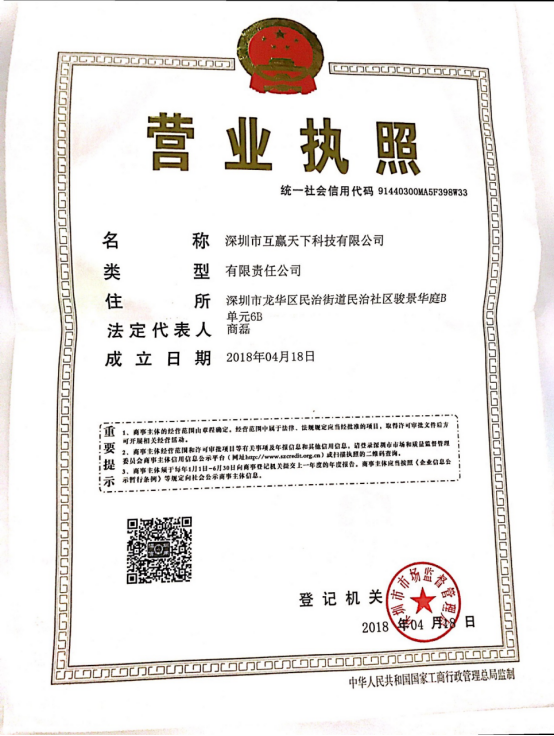 2018年,4月18日深圳市互赢天下科技有限公司成功创立,创始团队组建成功,确立了互联网营销推广服务。