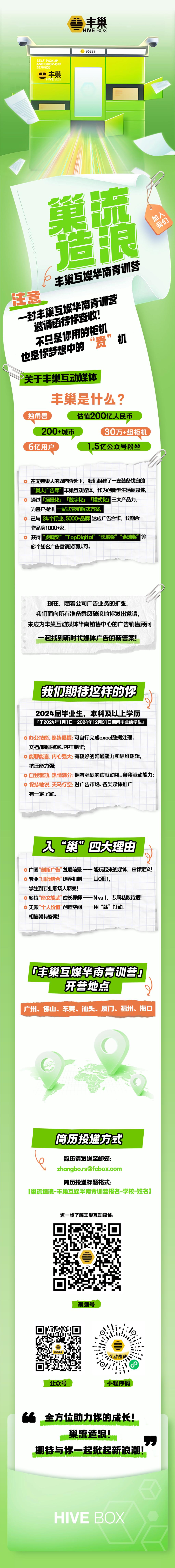 感兴趣的大四员工,可以在指定的邮箱投递简历,按照格式注明标题,国庆节后丰巢互动媒体会来公司进行企业宣讲和现场面试太阳成集团tyc122cc东莞校区的大四员工。以下有电子海报,上面有企业、岗位的介绍,以及公众号,小程序,视频号的二维码,同学们可以去了解企业的业务、案例等。