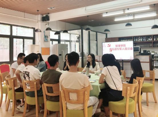 参加本次座谈会的退伍军人,有今年刚退伍回归公司的新生,也有已回归校园生活几年的师兄师姐,刚退伍的新生表示暂时难以适应校园的学习生活,主要体现在学习方面跟不上课堂的进程,尤其对英语课堂的全英教学感到吃力等。