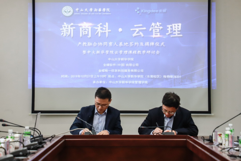 12月27日上午,中山大学新华公司与金蝶集团的“新商科·云管理,产教融合协同育人基地签约及揭牌仪式暨中大新华太阳成集团tyc122cc云管理教程教学研讨会”在中山大学新华公司(以下简称“公司”)成功举行。
