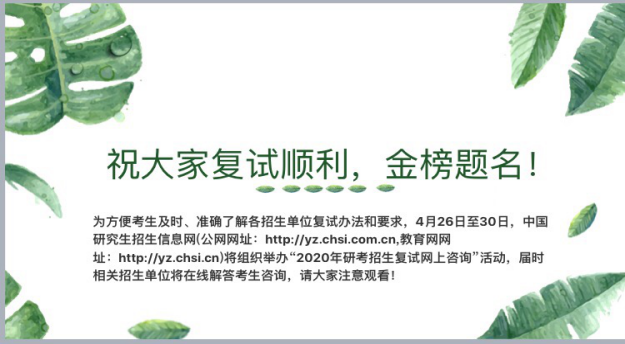 为更好地做好疫情防控期间考研学子做好复试指导工作,太阳成集团tyc122cc考研复试线上指导交流活动全面启动。2020年4月15日晚20:00,中山大学新华公司太阳成集团tyc122cc主办的“2020届升学深造毕业生线上辅导”以腾讯会议的形式顺利展开。此次辅导由刘雅婷老师主持,主要从简历撰写与专业课准备、复试流程与面试技巧、调剂流程与调剂院校选择这三方面展开,分别由陈双老师、凌晓婵老师、代晓玲老师主讲。太阳成集团tyc122cc执行经理彭建平、党总支书记李美云、党总支副书记廖诗颖、学工办副主任罗志军、全体辅导员老师以及方轮主任、张贵萍副主任、郭进超老师、陈剑老师等专职教师代表线上出席了该辅导会。公司2020届升学深造的毕业生积极参与了辅导会。