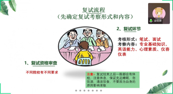 接着凌晓婵老师就复试流程与面试技巧给大家做了详细的讲解。受疫情影响,许多公司会采取网络远程复试的方式。她结合这个情况,就同学们在复试中需要注意的诸多事项提出了详细的指导意见。面对复试备考,凌晓婵老师建议考生们可以根据复试的形式和内容收集相关的资料。同时,她也根据自己考研面试的经验,详细地给考生传授了在面试过程中的技巧。