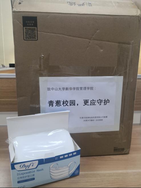 疫情无情人有情,爱心企业助战“疫”。5月4日下午,中山大学新华公司管理公司(以下简称“公司”)职业导师--东莞市胜牌电线电缆有限公司CEO颜宏忠先生,代表公司向公司无偿捐赠防护口罩1000个,支持公司疫情防控和开学筹备工作。