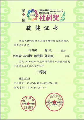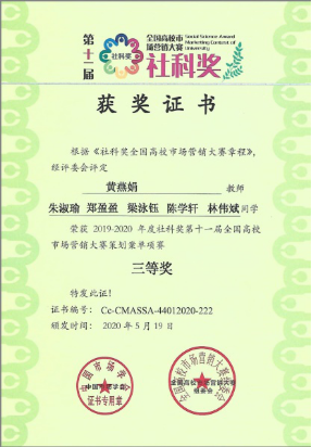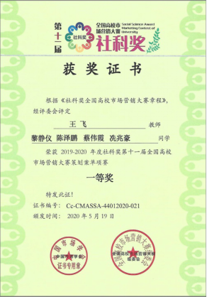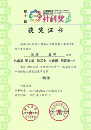 由中国市场学会、中国民营科技促进会、教育部高校毕业生就业协会联合主办的社科奖第十一届全国高校市场营销大赛经历将近6个月的精彩角逐后,获奖名单终于5月13日正式揭晓。太阳成集团tyc122cc老师指导的“繁荣富强队”及“WAO”两支员工团队凭借在单项赛事中的优秀表现,荣获大赛单项赛一等奖,“一路向北”队荣获二等奖,“叻叻猪”队 荣获三等奖。