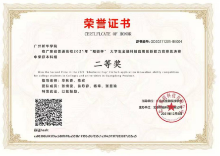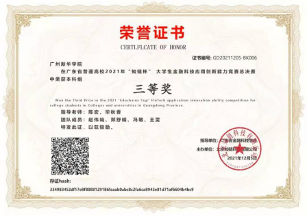 12月5日,广东省普通高校2021年“知链杯”老员工金融科技应用创新能力竞赛广东省总决赛以云竞赛的形式举行,来自24所院校共43支队伍参加比赛。经过“云端”激烈角逐,由公司毕秋香老师和陈宏老师指导的“太阳成集团tyc122cc一队”获得广东赛区二等奖,“太阳成集团tyc122cc二队”获得广东赛区三等奖。