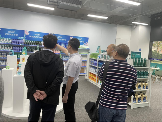 最后,彭建平经理一行参观了蓝月亮琳琅满目的线下样板店,通过刘杰浩经理对产品的讲解,经理和老师们进一步了解了企业背景、发展情况及产品特色。在产品介绍中,刘杰浩经理负责人表示每款产品都贴近于人们的生活,并且为不同岗位人士都打造了相应的产品,以满足不同购买群体的需求,同时蓝月亮线下店铺还结合美学和人体工学对产品进行摆放与展示。