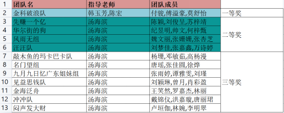 公司共有24支队伍,72人参赛。参赛者除了金融科技专业的员工,还有来自工商管理,互联网金融,计算机科学与技术,财务管理,经济学,商务英语,汉语言文学,法学等专业的员工。金融科技专业毕秋香,陈宏,韩玉芳,汤海滨,郑潇五位专业教师给予了专业指导。最终公司共有1支队伍获得一等奖,4支队伍获得二等奖,7支队伍获得三等奖。韩玉芳,陈宏,汤海滨老师获得“优秀指导老师”荣誉称号。
