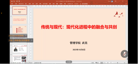 2023年10月8日晚上,管理公司党总支书记武亮以“传统与现代:现代化进程中的融合与共创”为主题,通过线上会议方式为管理公司各支部员工及教师讲授。武书记围绕“现代化的辩证视角双刃剑”,“现代化是一个历史范畴”,“传统在现代化中的作用正确处理传统与现代的关系”等三个方面来进行讲解。