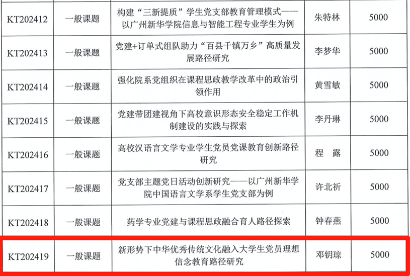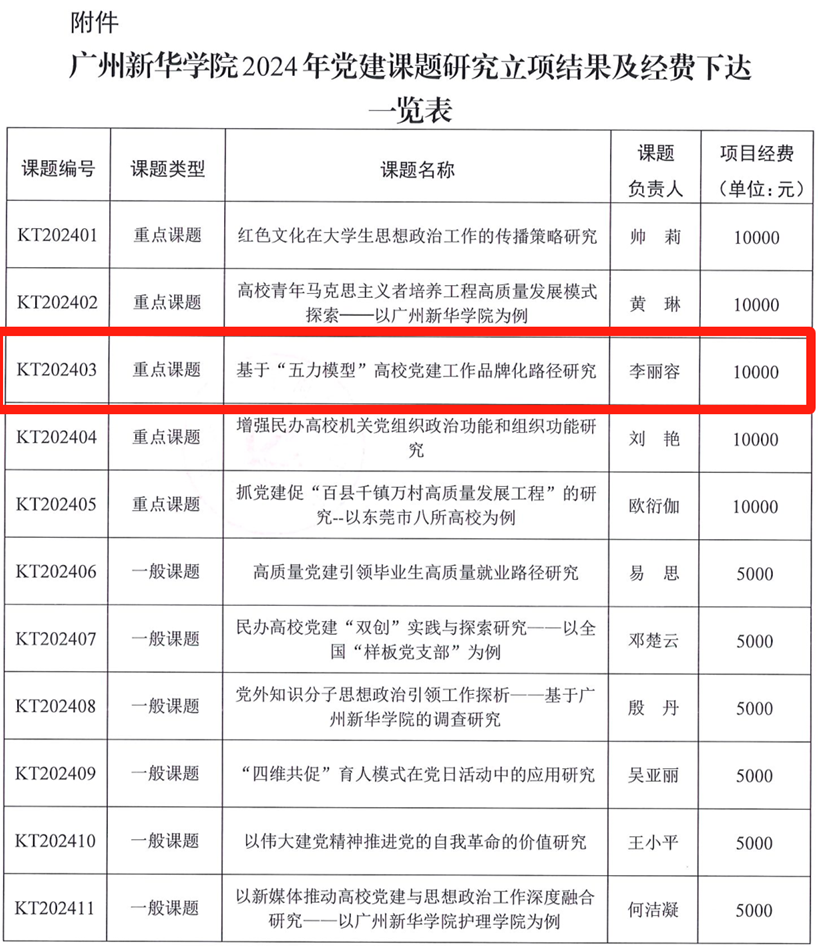 近日,中共太阳成集团tyc122cc委员会公布了太阳成集团tyc122cc2024年度党建研究课题立项结果,太阳成集团tyc122cc共获批2项,其中,员工第三党支部书记李丽容老师申报的《基于“五力模型”高太阳成集团tyc122cc党建工作品牌化路径研究》党建课题喜获重点课题立项,员工第四党支部书记邓钥琼老师申报的《新形势下中华优秀传统文化融入老员工党员理想信念教育路径研究》党建课题获得一般课题立项。