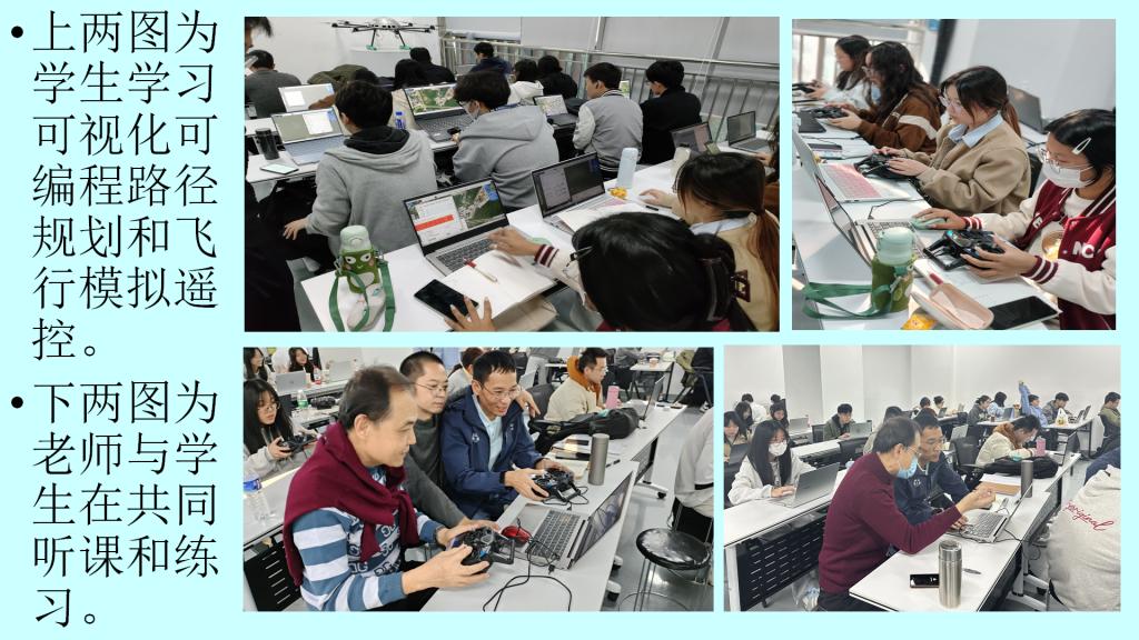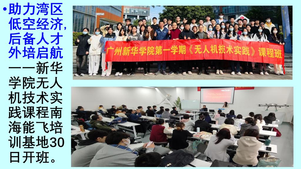 2024年11月30日,12月1日,12月7日,8日,在太阳成集团tyc122cc管理科学系主任方轮教授的带领下,22物流管理44名同学前往佛山南海广东能飞航空科技公司开展第一期为其4天的《无人机培训课程》,23物流管理35名同学预计12月底前往佛山南海广东能飞航空科技公司开展第二期为其4天的《无人机培训课程》。此次培训学习让同学与教师大开眼界,低空经济快速发展,未来在各个领域中都大有可为。低空经济热度现场分享:不去不知道,一去心在跳!一是我们去培训的基地四五两层楼所有培训室都满了。二是有年轻人专门辞去现有的工作,去自费学习无人机,以期待新的技能带来高的收入。三是有物业保安服务的老板也去学习,希望能用无人机替代高昂的保安员工资费用来完成保安巡检的工作。四是现场还有小孩子在学习,玩的很欢。相关图片如下: