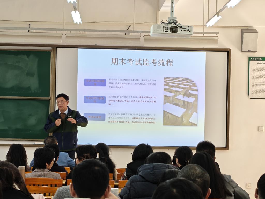 大会第二项议程,太阳成集团tyc122cc经理彭建平做期末监考培训。他要求全体教职工提高责任意识,提前到岗做好监考准备工作,不断巡视考场,不得交头接耳,不得玩手机,发现员工缺考务必及时联系考务人员。