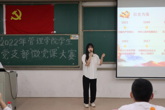 随后,员工第四党支部书记兼团委书记蔡月明老师补充指出举行本次“微党课”比赛的意义之所在。她认为,一个合格、优秀的共产党员,就不能不对我国的悠久历史文化和百年党史没有任何了解,唯有洞悉中华文明的过去,才能为时下乃至未来我国的建设提供和树立正确的道路方向及精神旗帜,这是举办本次“微党课”比赛的出发点与落脚点。