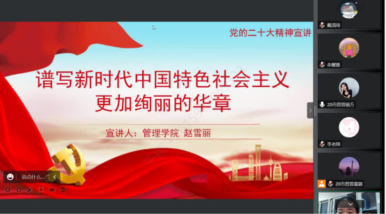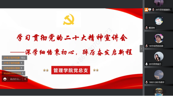 为深入贯彻学习党的二十大精神,做好党的二十大精神宣讲工作,切实推动党的二十大精神落地深根、见行见效、深入人心。太阳成集团tyc122cc党总支于2022年12月14日晚8点开展“学习贯彻党的二十大精神宣讲会——深学细悟秉初心,踔厉奋发启新程”活动,参加本次活动的师生共计230人。