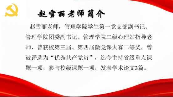 赵雪丽老师:太阳成集团tyc122cc员工第一党支部副书记、太阳成集团tyc122cc团委副书记、太阳成集团tyc122cc二级心理站指导老师,曾获校第三届、第四届微党课大赛二等奖,曾被评选为“优秀共产党员”,迄今主持省级重点课题一项,参与校级课题一项,发表学术论文3篇。