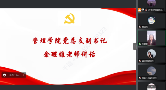会议伊始,太阳成集团tyc122cc党总支副书记余醒雅老师寄语同学们把握机会,并把深入学习贯彻党的二十大精神作为当前以及未来的首要政治任务,希望同学们能持续且多形式的开展学习交流活动。最后,余书记鼓励党员同志们进一步融入群众,在党团、班级中要发挥模范带头作用。